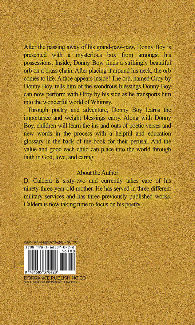 After the passing away of his grand-paw-paw, Donny Boy is presented with a mysterious box from amongst his possessions. Inside, Donny Bow finds a strikingly beautiful orb on a brass chain. After placing it around his neck, the orb comes to life. A face appears inside! The orb, named Orby by Donny Boy, tells him of the wondrous blessings Donny Boy can now perform with Orby by his side as he transports him into the wonderful world of Whimsy.