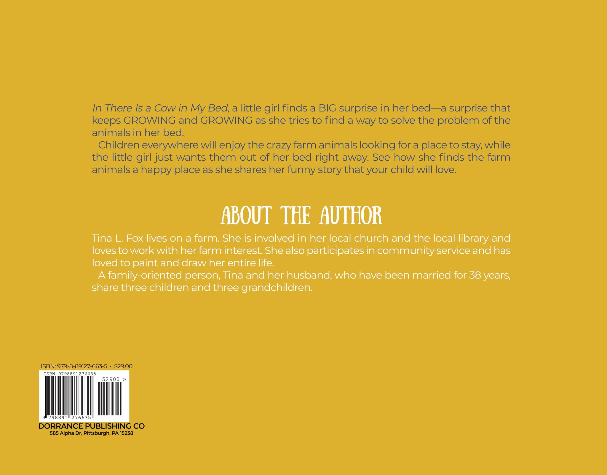 Tina L. Fox lives on a farm. She is involved in her local church and the local library and loves to work with her farm interest. She also participates in community service and has loved to paint and draw her entire life.