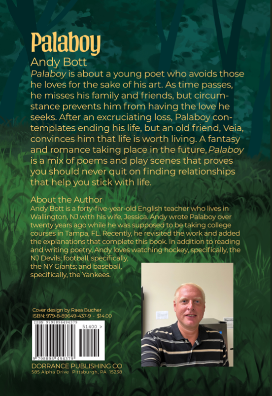 Andy Bott is a forty-five-year-old English teacher who lives in Wallington, NJ with his wife, Jessica. Andy wrote Palaboy over twenty years ago while he was supposed to be taking college courses in Tampa, FL. Recently, he revisited the work and added the explanations that complete this book. In addition to reading and writing poetry, Andy loves watching hockey, specifically, the NJ Devils; football, specifically, the NY Giants; and baseball, specifically, the Yankees.
