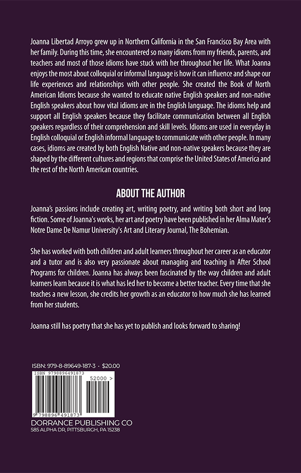 Joanna Libertad Arroyo grew up in Northern California in the San Francisco Bay Area with her family. During this time, she encountered so many idioms from my friends, parents, and teachers and most of those idioms have stuck with her throughout her life. What Joanna enjoys the most about colloquial or informal language is how it can influence and shape our life experiences and relationships with other people. She created the Book of North American Idioms because she wanted to educate native English speakers and non-native English speakers about how vital idioms are in the English language. The idioms help and support all English speakers because they facilitate communication between all English speakers regardless of their comprehension and skill levels. Idioms are used in everyday in English colloquial or English informal language to communicate with other people. In many cases, idioms are created by both English Native and non-native speakers because they are shaped by the different cultures and regions that comprise the United States of America and the rest of the North American countries.