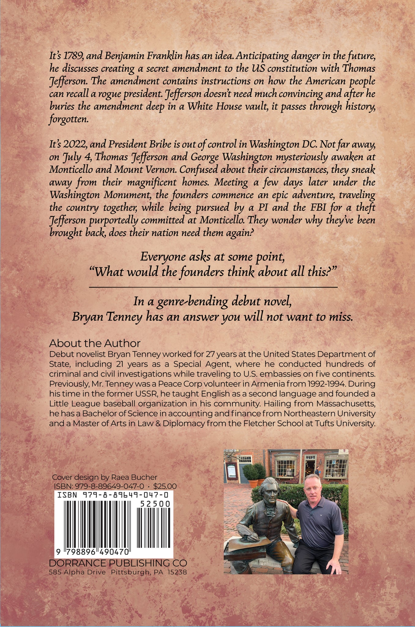 It’s 2022, and President Bribe is out of control in Washington DC. Not far away, on July 4, Thomas Jefferson and George Washington mysteriously awaken at Monticello and Mount Vernon. Confused about their circumstances, they sneak away from their magnificent homes. Meeting a few days later under the Washington Monument, the founders commence an epic adventure, traveling the country together, while being pursued by a PI and the FBI for a theft Jefferson purportedly committed at Monticello. They wonder why they’ve been brought back, does their nation need them again?