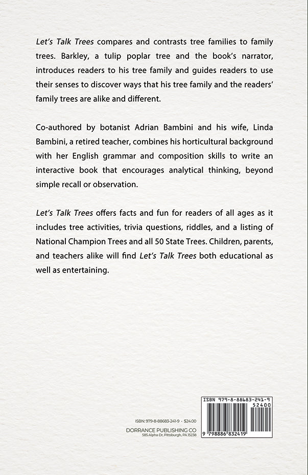 Let’s Talk Trees offers facts and fun for readers of all ages as it includes tree activities, trivia questions, riddles, and a listing of National Champion Trees and all 50 State Trees. Children, parents, and teachers alike will find Let’s Talk Trees both educational as well as entertaining.