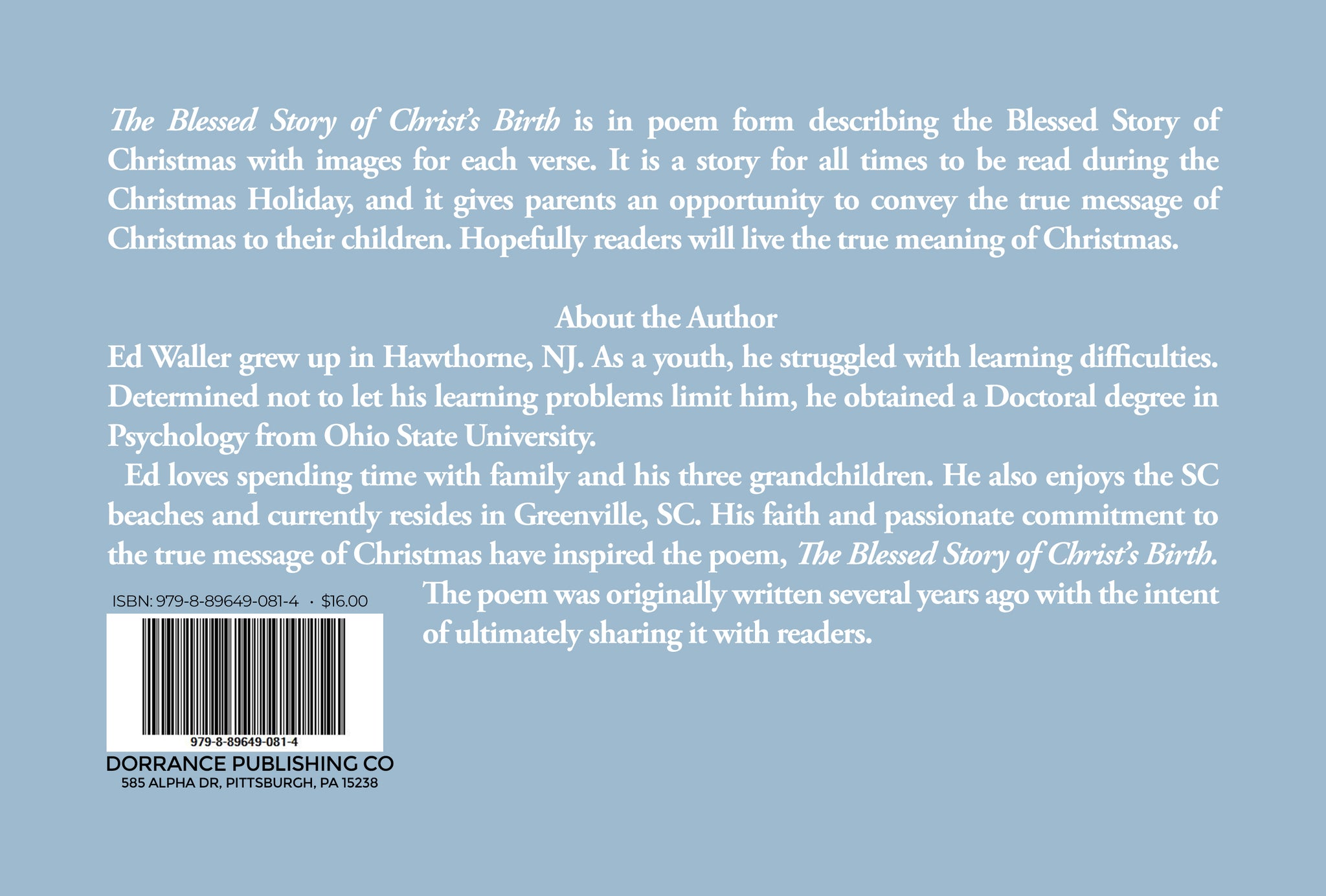 Ed loves spending time with family and his three grandchildren. He also enjoys the SC beaches and currently resides in Greenville, SC. His faith and passionate commitment to the true message of Christmas have inspired the poem, The Blessed Story of Christ’s Birth. The poem was originally written several years ago with the intent of ultimately sharing it with readers.