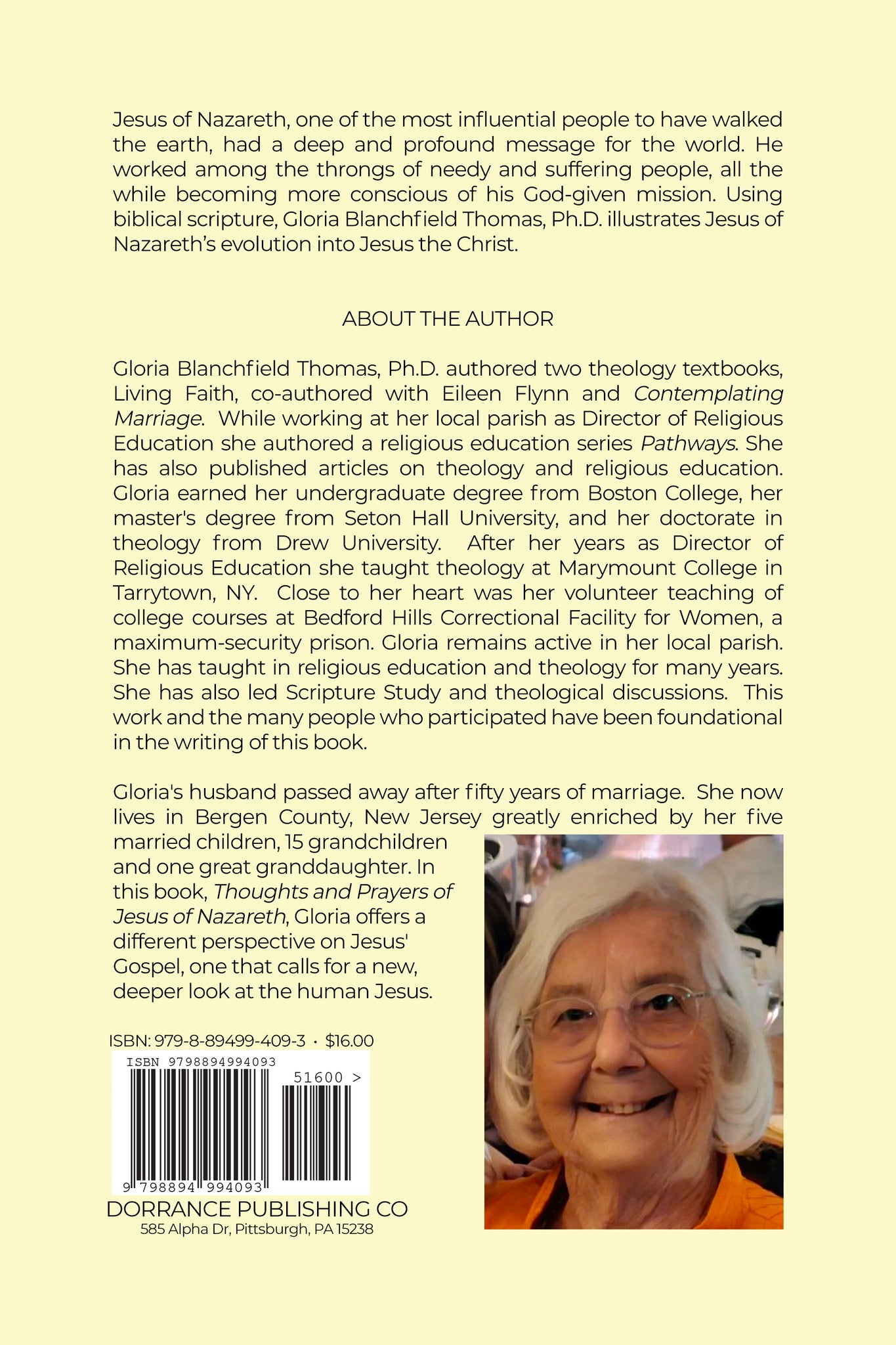 Gloria's husband passed away after fifty years of marriage.  She now lives in Bergen County, New Jersey greatly enriched by her five married children, 15 grandchildren and one great granddaughter. In this book, Thoughts and Prayers of Jesus of Nazareth, Gloria offers a  different perspective on Jesus' Gospel, one that calls for a new, deeper look at the human Jesus.