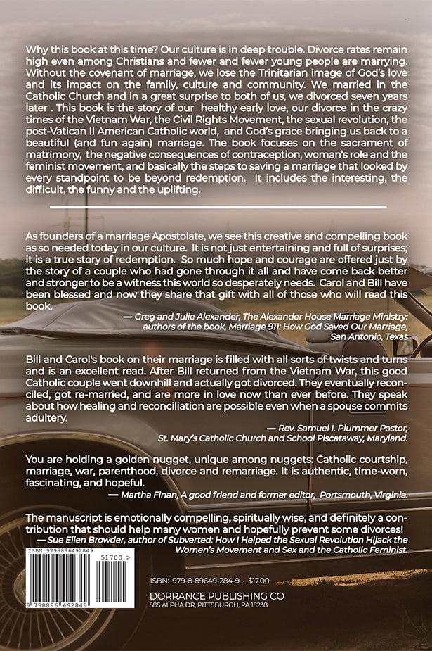 "As founders of a marriage Apostolate, we see this creative and compelling book as so needed today in our culture.  It is not just entertaining and full of surprises; it is a true story of redemption.  So much hope and courage are offered just by the story of a couple who had gone through it all and have come back better and stronger to be a witness this world so desperately needs.  Carol and Bill have been blessed and now they share that gift with all of those who will read this book."