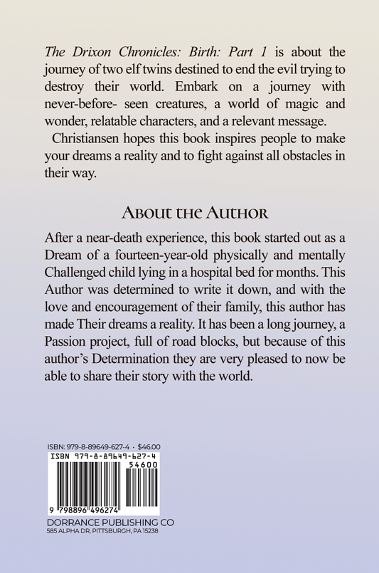 The Drixon Chronicles: Birth: Part 1 is about the journey of two elf twins destined to end the evil trying to destroy their world. Embark on a journey with never-before-seen creatures, a world of magic and wonder, relatable characters, and a relevant message.