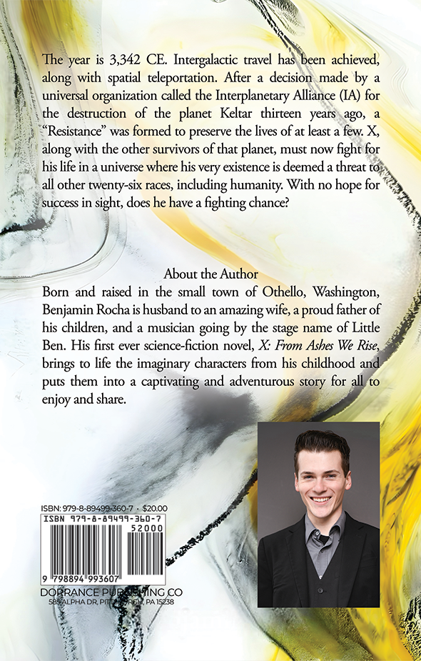 Born and raised in the small town of Othello, Washington, Benjamin Rocha is husband to an amazing wife, a proud father of his children, and a musician going by the stage name of Little Ben. His first ever science-fiction novel, X: From Ashes We Rise, brings to life the imaginary characters from his childhood and puts them into a captivating and adventurous story for all to enjoy and share.
