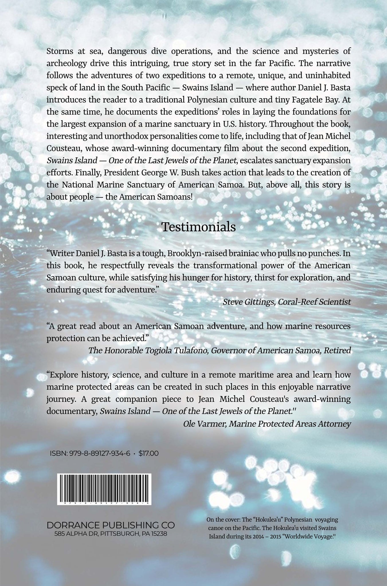 Storms at sea, dangerous dive operations, and the science and mysteries of archeology drive this intriguing, true story set in the far Pacific. The narrative follows the adventures of two expeditions to a remote, unique, and uninhabited speck of land in the South Pacific — Swains Island — where author Daniel J. Basta introduces the reader to a traditional Polynesian culture and tiny Fagatele Bay. At the same time, he documents the expeditions’ roles in laying the foundations for the largest expansion of a marine sanctuary in U.S. history. Throughout the book, interesting and unorthodox personalities come to life, including that of Jean Michel Cousteau, whose award-winning documentary film about the second expedition, Swains Island — One of the Last Jewels of the Planet, escalates sanctuary expansion efforts. Finally, President George W. Bush takes action that leads to the creation of the National Marine Sanctuary of American Samoa. But, above all, this story is about people — the American Samoans!