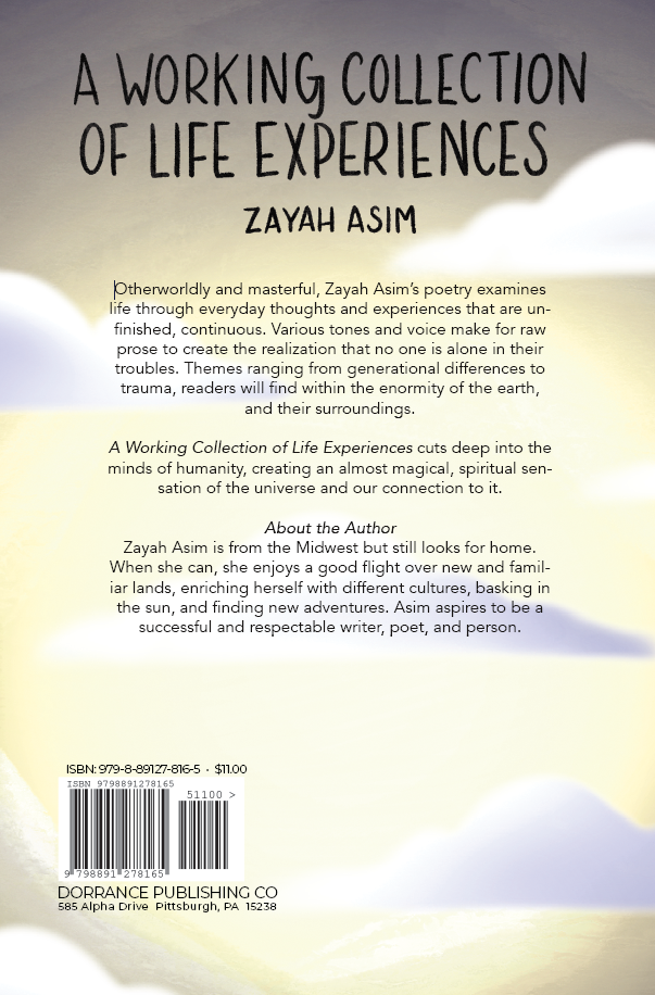 Otherworldly and masterful, Zayah Asim’s poetry examines life through everyday thoughts and experiences that are unfinished, continuous. Various tones and voice make for raw prose to create the realization that no one is alone in their troubles. Themes ranging from generational differences to trauma, readers will find within the enormity of the earth, and their surroundings.