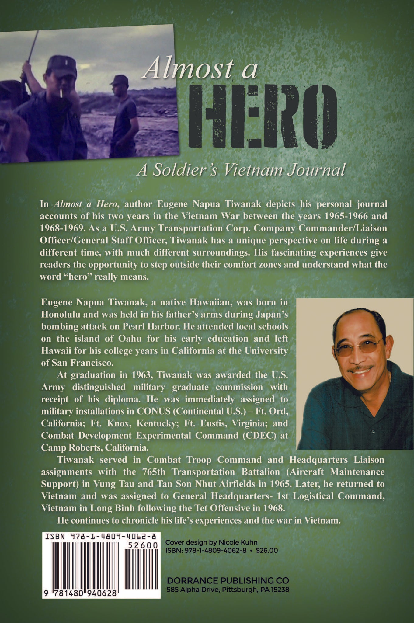 In Almost a Hero, author Eugene Napua Tiwanak depicts his personal journal accounts of his two years in the Vietnam War between the years 1965-1966 and 1968-1969. As a U.S. Army Transportation Corp. Company Commander/Liaison Officer/General Staff Officer, Tiwanak has a unique perspective on life during a different time, with much different surroundings. His fascinating experiences give readers the opportunity to step outside their comfort zones and understand what the word “hero” really means.