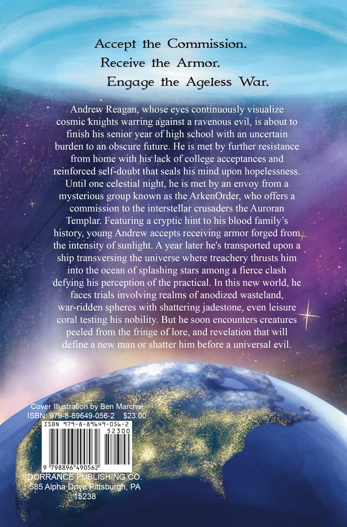 Andrew Reagan, whose eyes continuously visualize cosmic knights warring against a ravenous evil, is about to finish his senior year of high school with an uncertain burden to an obscure future. He is met by further resistance from home with his lack of college acceptances and reinforced self-doubt that seals his mind upon hopelessness. Until one celestial night, he is met by an envoy from a mysterious group known as the ArkenOrder, who offers a commission to the interstellar crusaders the Auroran Templar. Featuring a cryptic hint to his blood family’s history, young Andrew accepts receiving armor forged from the intensity of sunlight. A year later he's transported upon a ship transversing the universe where treachery thrusts him into the ocean of splashing stars among a fierce clash defying his perception of the practical. In this new world, he faces trials involving realms of anodized wasteland, war-ridden spheres with shattering jadestone, even leisure coral testing his nobility. But he soon encounters creatures peeled from the fringe of lore, and revelation that will define a new man or shatter him before a universal evil.
