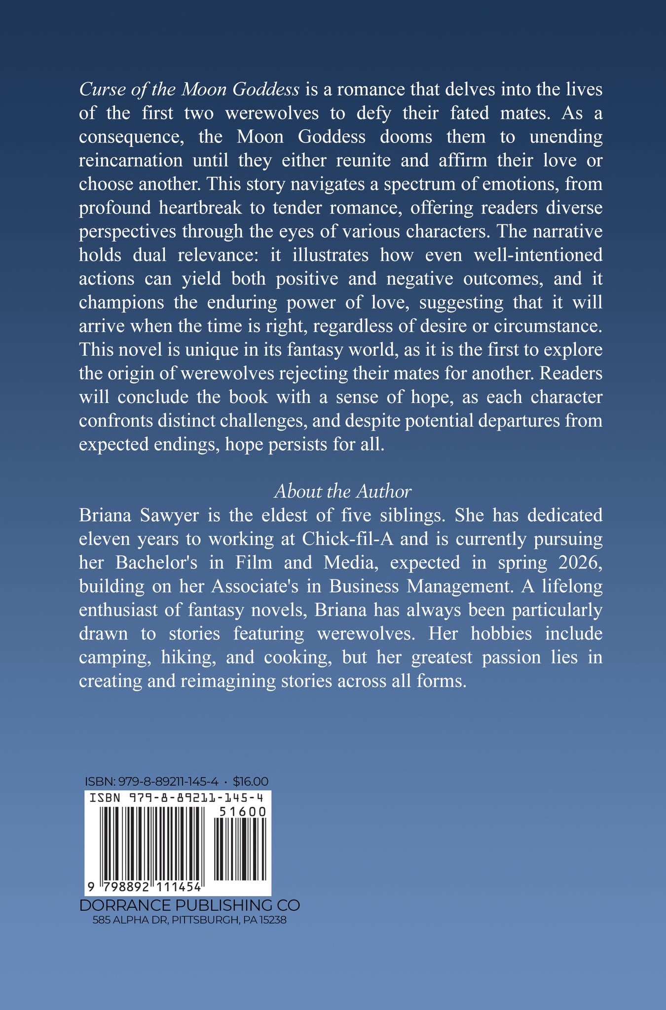 Briana Sawyer is the eldest of five siblings. She has dedicated eleven years to working at Chick-fil-A and is currently pursuing her Bachelor's in Film and Media, expected in spring 2026, building on her Associate's in Business Management. A lifelong enthusiast of fantasy novels, Briana has always been particularly drawn to stories featuring werewolves. Her hobbies include camping, hiking, and cooking, but her greatest passion lies in creating and reimagining stories across all forms.