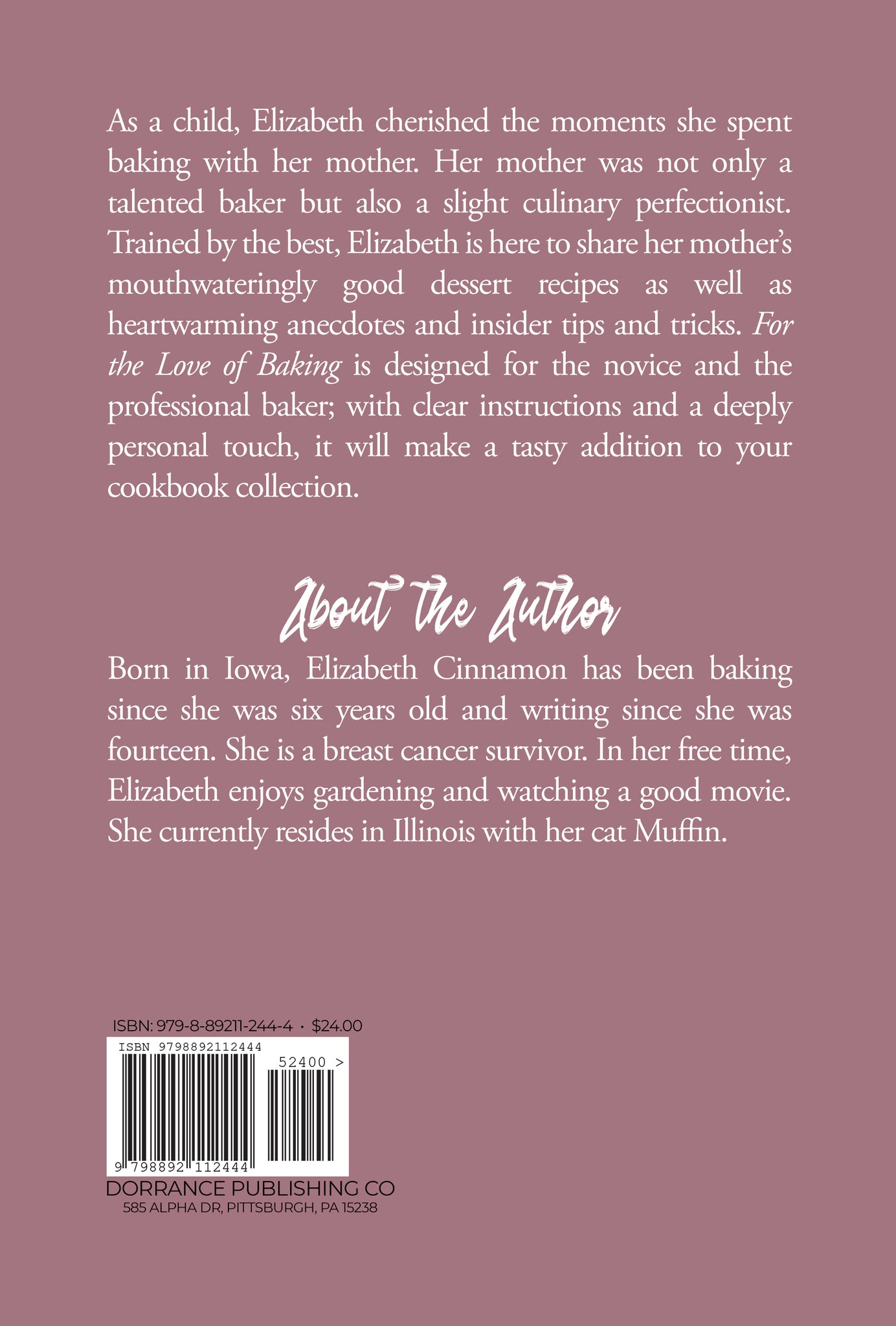 As a child, Elizabeth cherished the moments she spent baking with her mother. Her mother was not only a talented baker but also a slight culinary perfectionist. Trained by the best, Elizabeth is here to share her mother’s mouthwateringly good dessert recipes as well as heartwarming anecdotes and insider tips and tricks. For the Love of Baking is designed for the novice and the professional baker; with clear instructions and a deeply personal touch, it will make a tasty addition to your cookbook collection.
