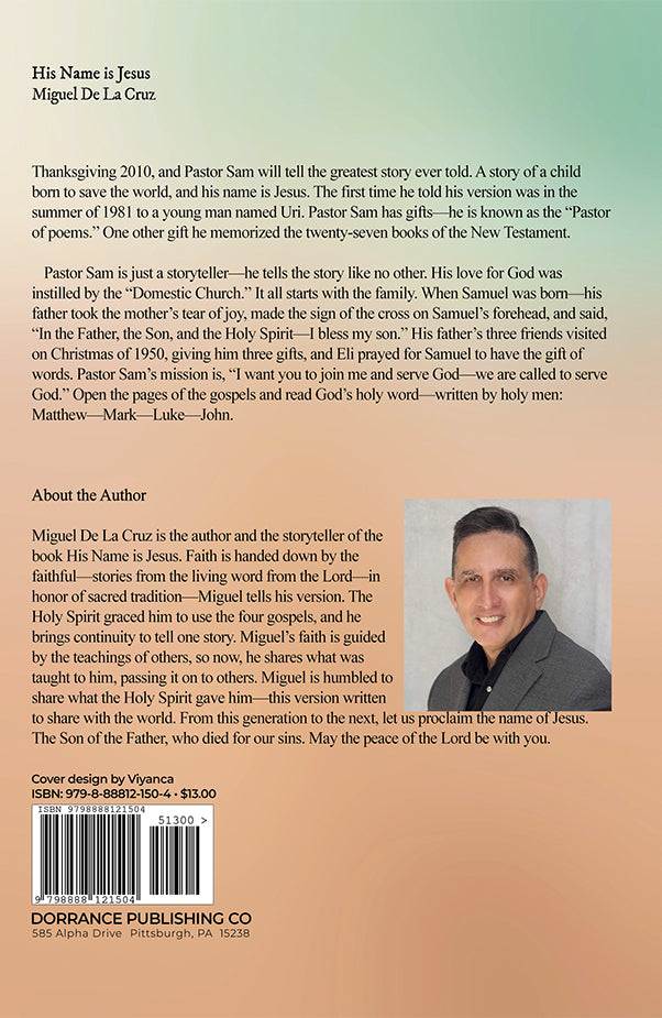 Miguel De La Cruz is the author and the storyteller of the book His Name is Jesus. Faith is handed down by the faithful—stories from the living word from the Lord—in honor of sacred tradition—Miguel tells his version. The Holy Spirit graced him to use the four gospels, and he brings continuity to tell one story. Miguel’s faith is guided by the teachings of others, so now, he shares what was taught to him, passing it on to others. Miguel is humbled to share what the Holy Spirit gave him—this version written to share with the world. From this generation to the next, let us proclaim the name of Jesus. The Son of the Father, who died for our sins. May the peace of the Lord be with you.