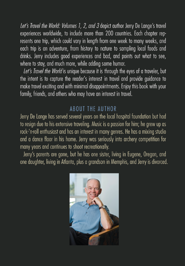 Let's Travel the World: Volumes 1, 2, and 3 depict author Jerry De Lange's travel experiences worldwide, to include more than 200 countries. Each chapter represents one trip, which could vary in length from one week to many weeks, and each trip is an adventure, from history to nature to sampling local foods and drinks. Jerry includes good experiences and bad, and points out what to see, where to stay, and much more, while adding some humor.