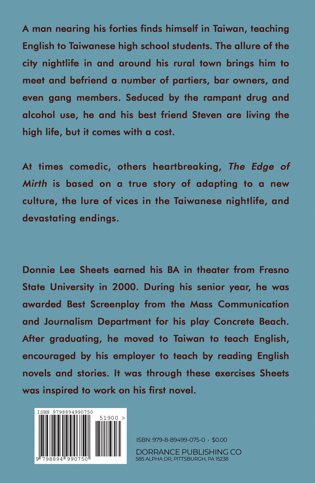Donnie Lee Sheets earned his BA in theater from Fresno State University in 2000. During his senior year, he was awarded Best Screenplay from the Mass Communication and Journalism Department for his play Concrete Beach. After graduating, he moved to Taiwan to teach English, encouraged by his employer to teach by reading English novels and stories. It was through these exercises Sheets was inspired to work on his first novel.